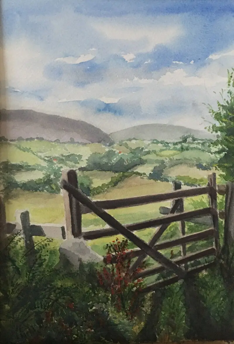 Original painting of a tranquil English scene overlooking countryside from a farm gate.