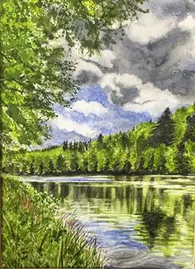 Lake view with trees in summer. I loved painting the shadows and reflections in the lake.