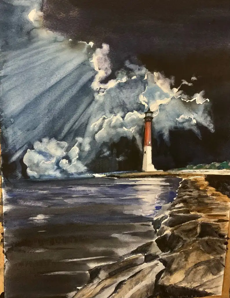Dramatic painting of a lighthouse in the moonlight under heavy skies. Lovely reflections in the water and rays of moonlight.