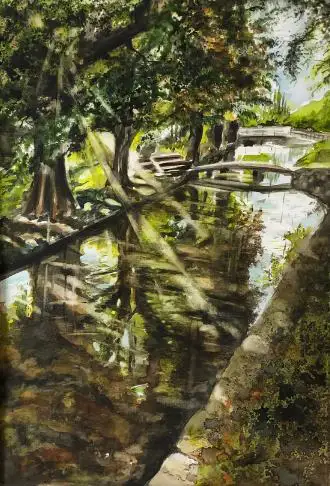 An original and unique watercolour painting of a still canal in summer sun with reflections of surrounding trees and foliage. Peaceful vibrations!